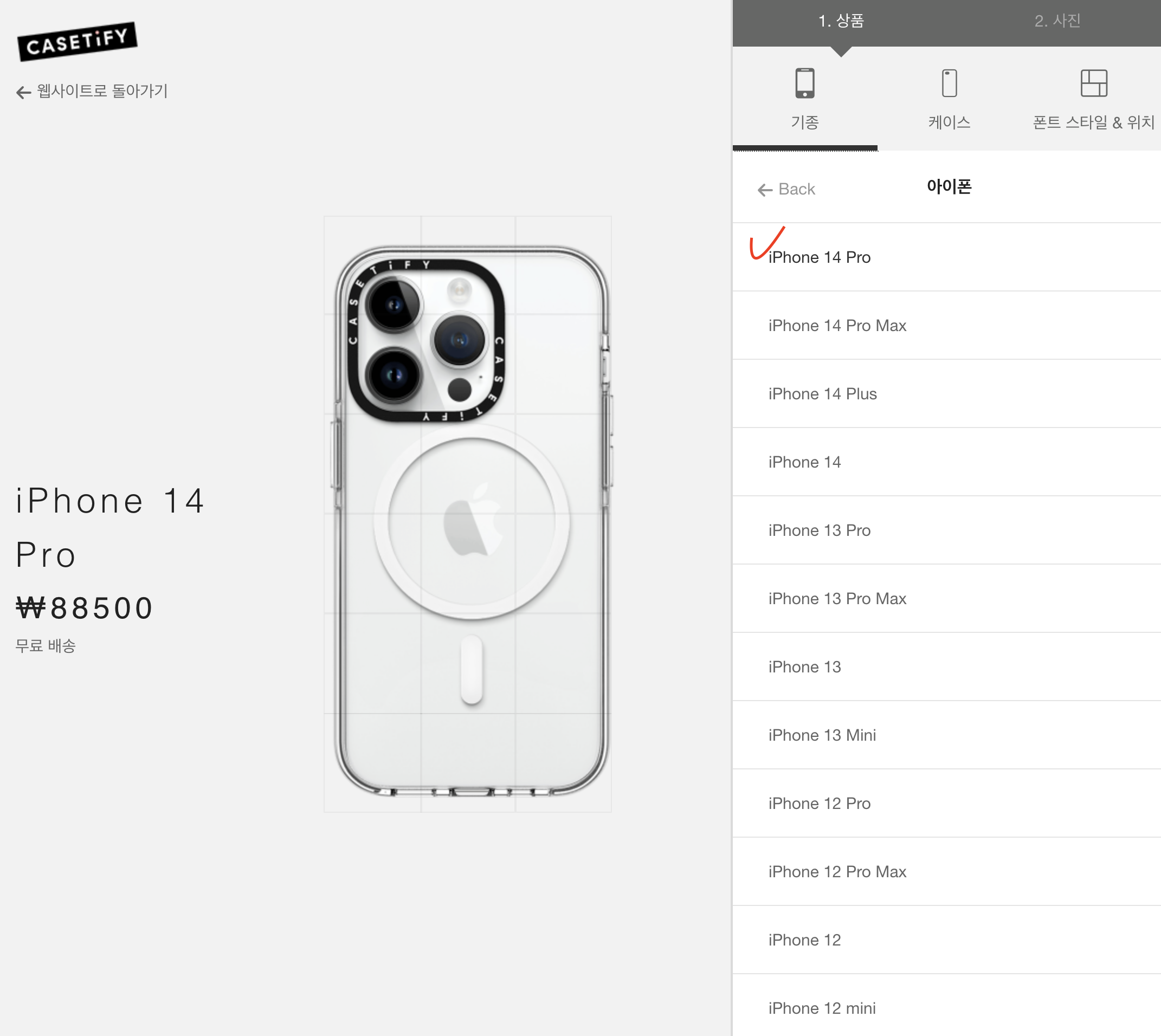 커스텀 제작할 기종을 선택하면 바로 제품 기종 선택화면으로 넘어감